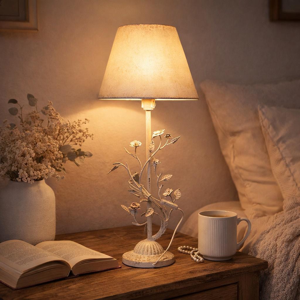 Lampada da Tavolo in Ferro Bianco con Fiori