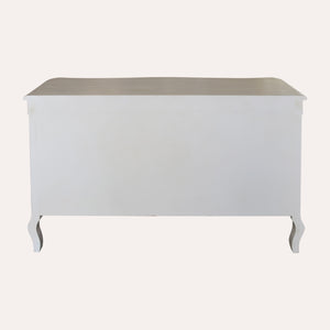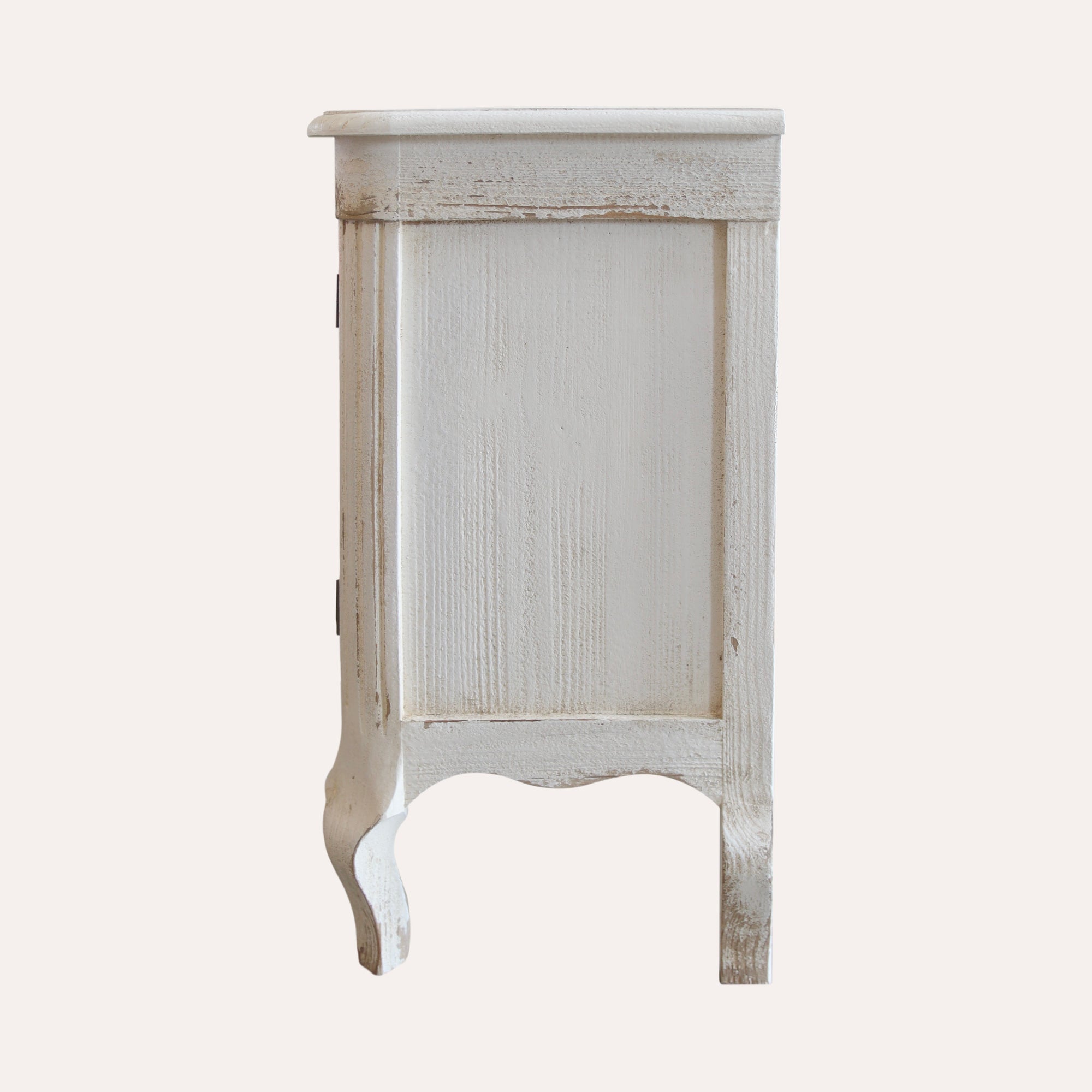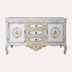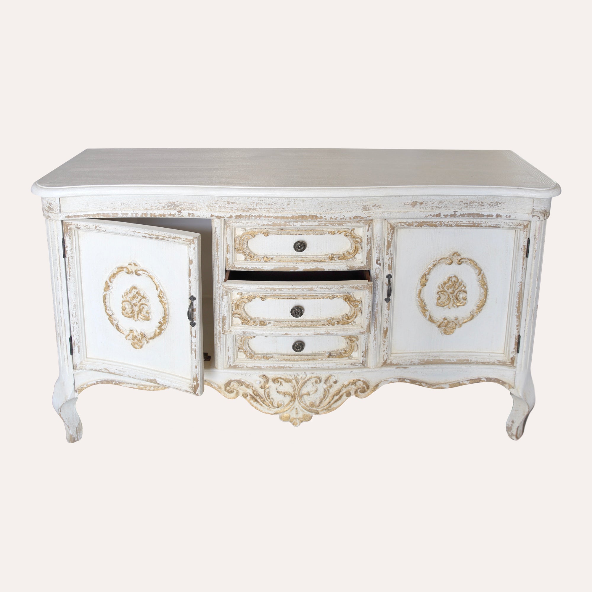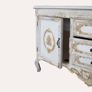 Cassettiera in legno a 3 cassetti e 2 ante realizzata in legno dallo stile shabby di color bianco anticato, decori dorati, pomoli in ferro.
