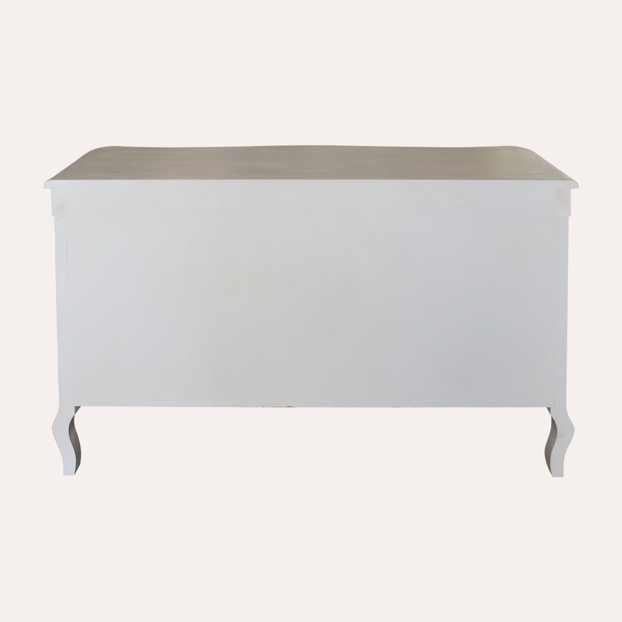 Questa cassettiera offre anche un'amplia capacità di archiviazione. Con diversi cassetti spaziosi e le due ante, potrai organizzare e riporre comodamente i tuoi oggetti personali, dai vestiti agli accessori o agli oggetti decorativi. I cassetti e le ante sono dotati di manopole decorative in metallo, che aggiungono un ulteriore tocco di eleganza.
