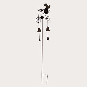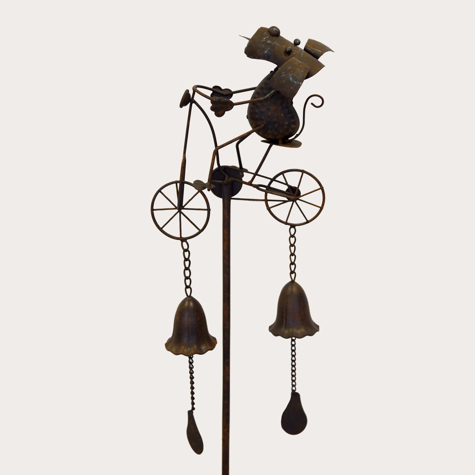Piantone decorativo in ferro con un cane in bicicletta e due campanelle, perfetto per giardini e spazi esterni. Colore marrone scuro, resistente e originale.
