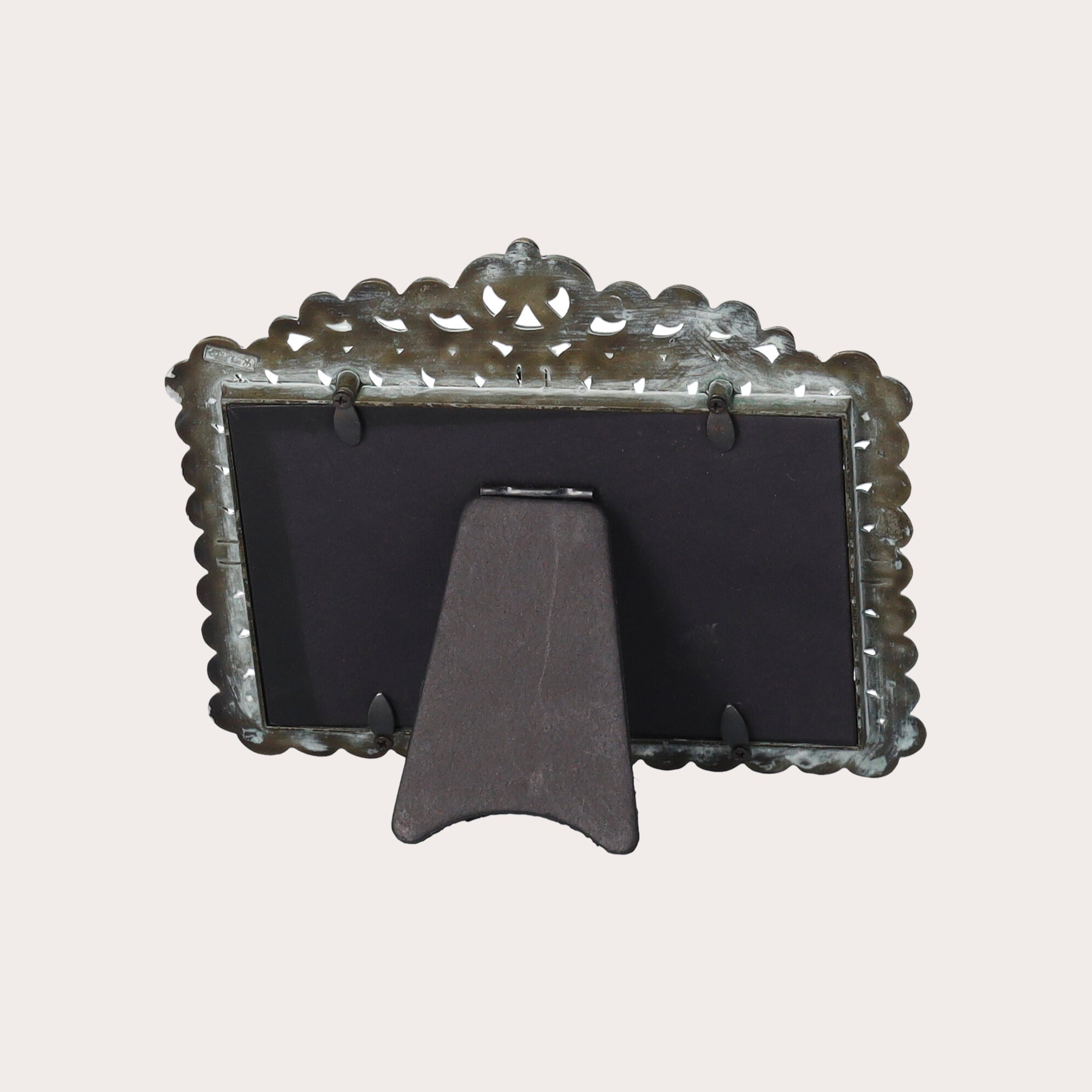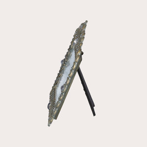 Aggiungi un tocco di eleganza e raffinatezza alla tua casa con la nostra cornice portafoto in metallo antichizzato, ispirata allo stile rococò. Questo sofisticato portafoto è arricchito da gemme bianche incastonate tra i decori classici, creando un effetto di lusso e opulenza. Un ulteriore decoro nella parte superiore completa il design, offrendo un accento stilistico unico.