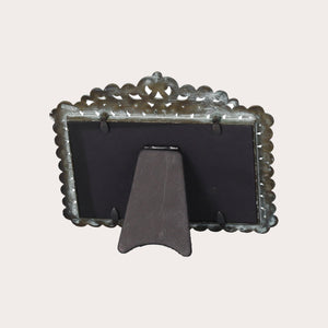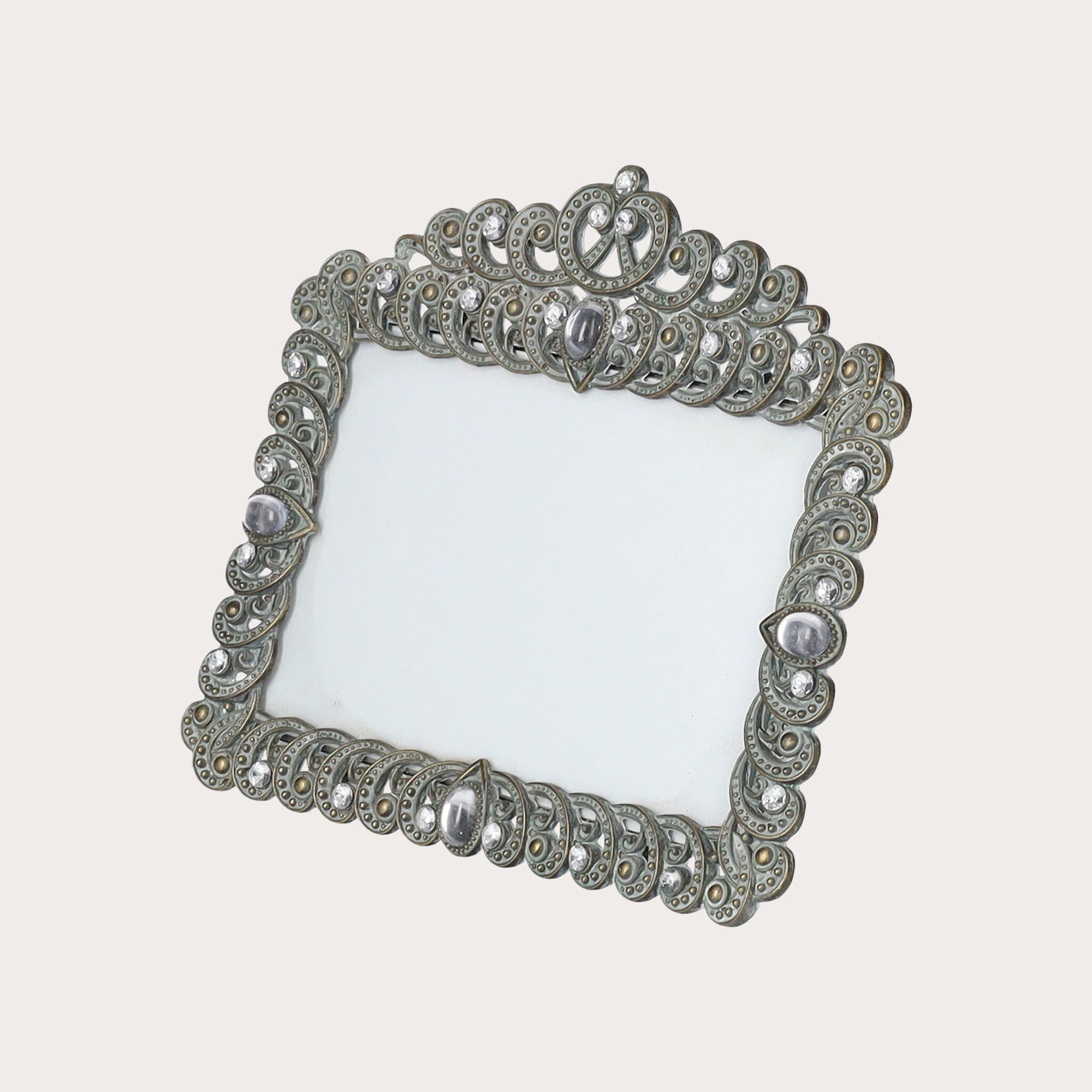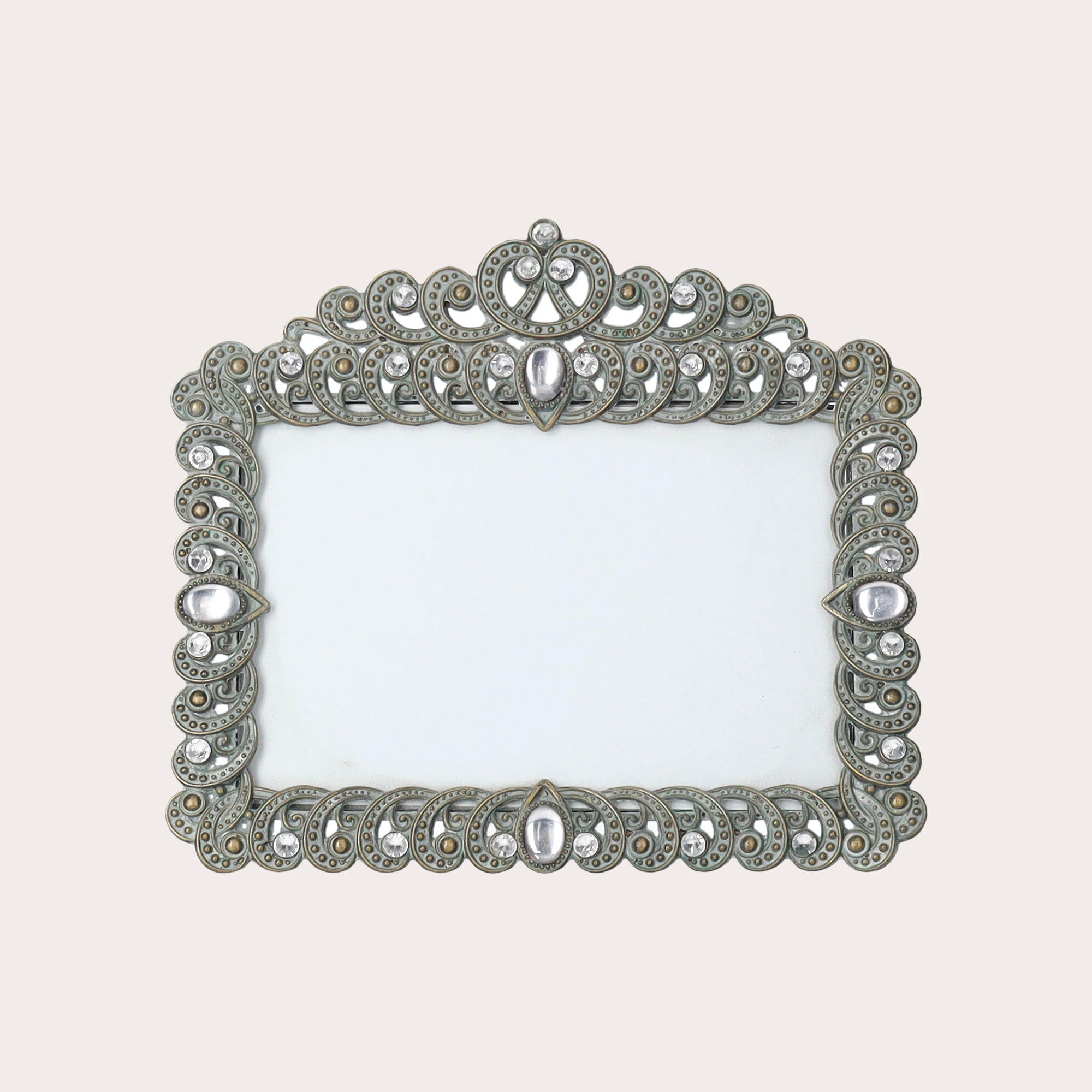 Cornice portafoto in metallo antichizzato stile rococò, con gemme bianche e decoro superiore. Per foto fino a 15x10 cm, solo orizzontale. Elegante e raffinata.