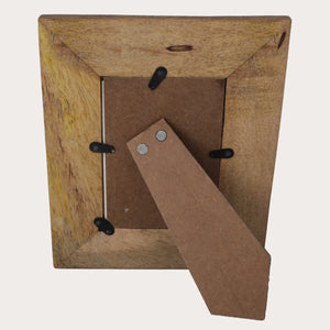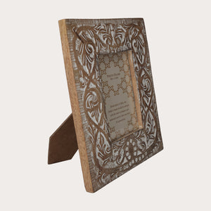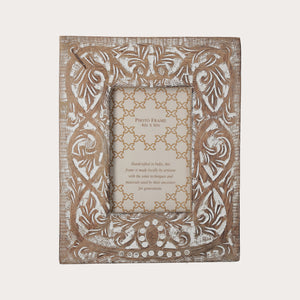 Cornice decorativa portafoto in legno intagliato, lavorata a mano e decorata con motivi bianchi. Perfetta come soprammobile per interni, arricchisce ogni spazio con un tocco di eleganza.