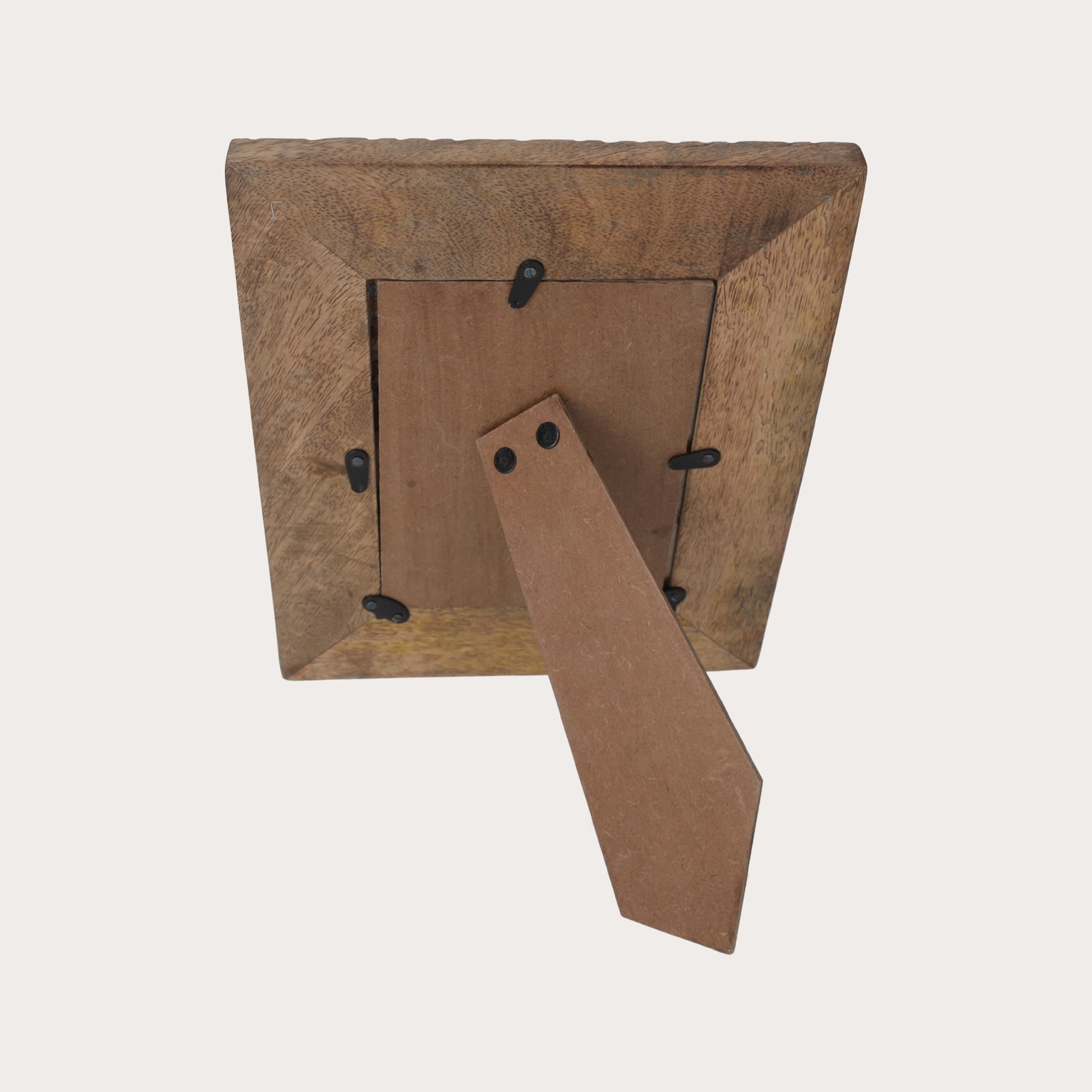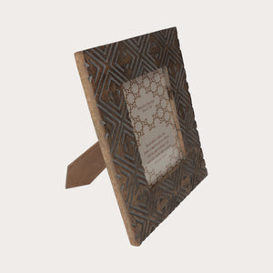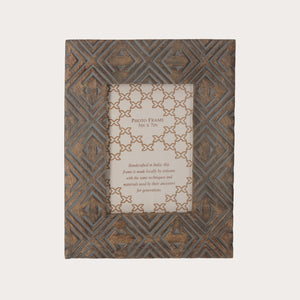Cornice decorativa portafoto in legno intagliato e lavorata a mano, con eleganti trafori e motivi bianchi. Ideale come soprammobile per interni, aggiunge un tocco di stile a ogni ambiente.
