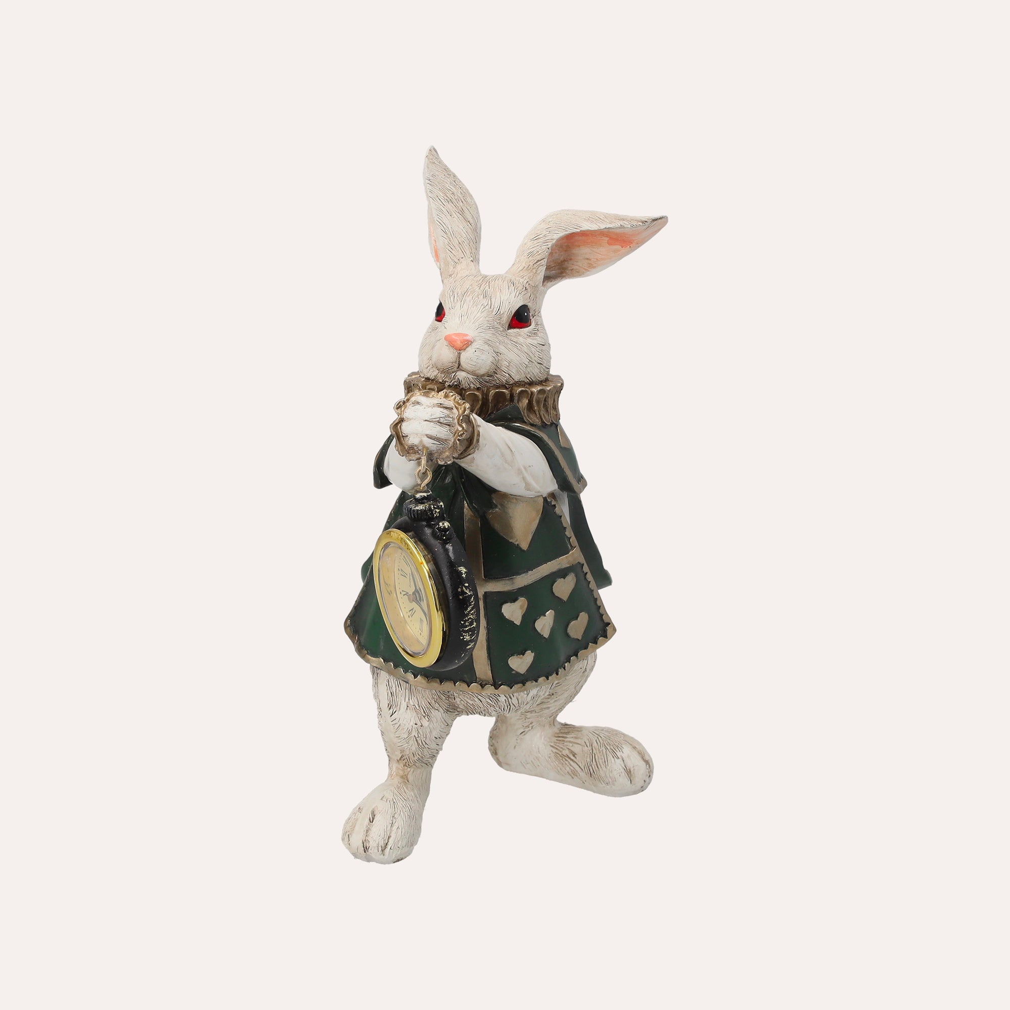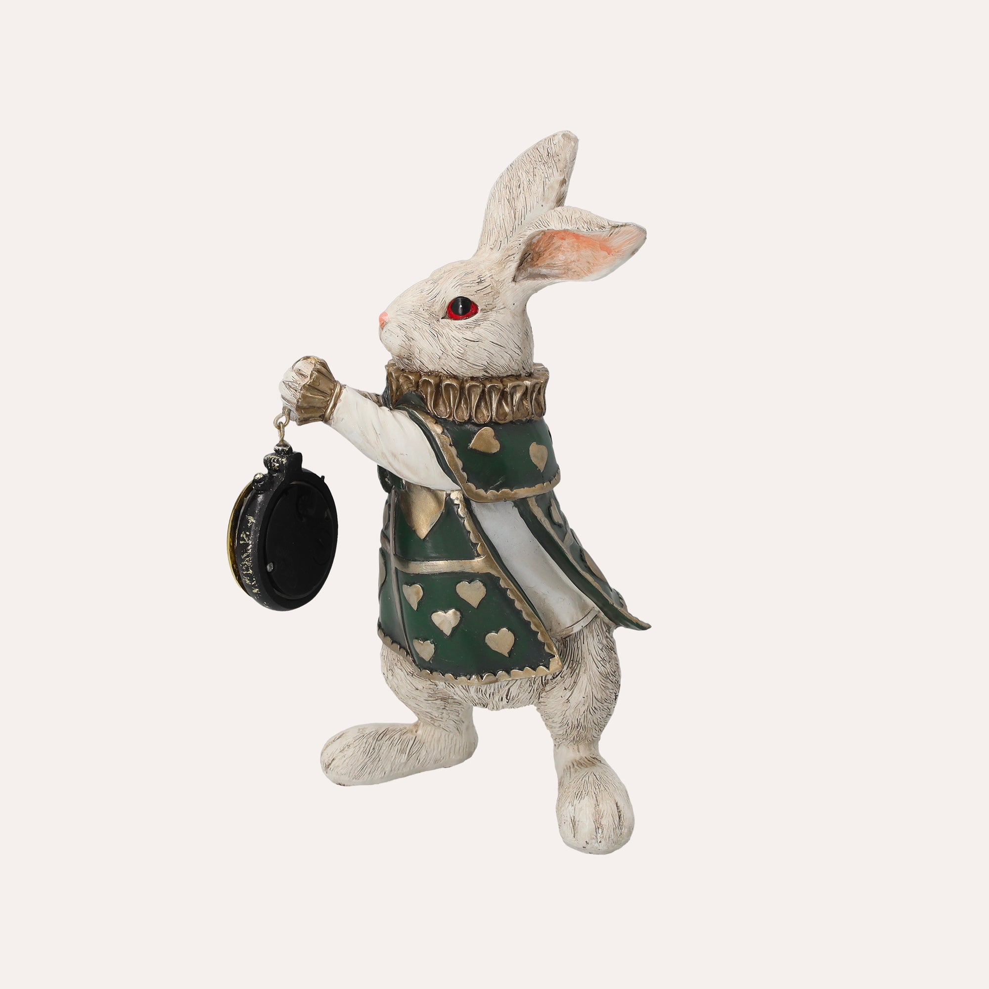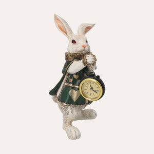 Statuina in resina del Bianconiglio con Orologio, ispirata ad "Alice nel Paese delle Meraviglie". Perfetta come decorazione o bomboniera. Altezza 24 cm, diametro 14 cm.