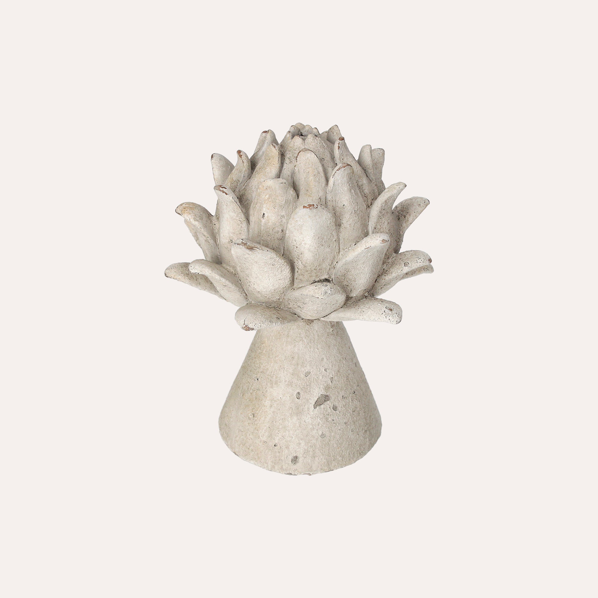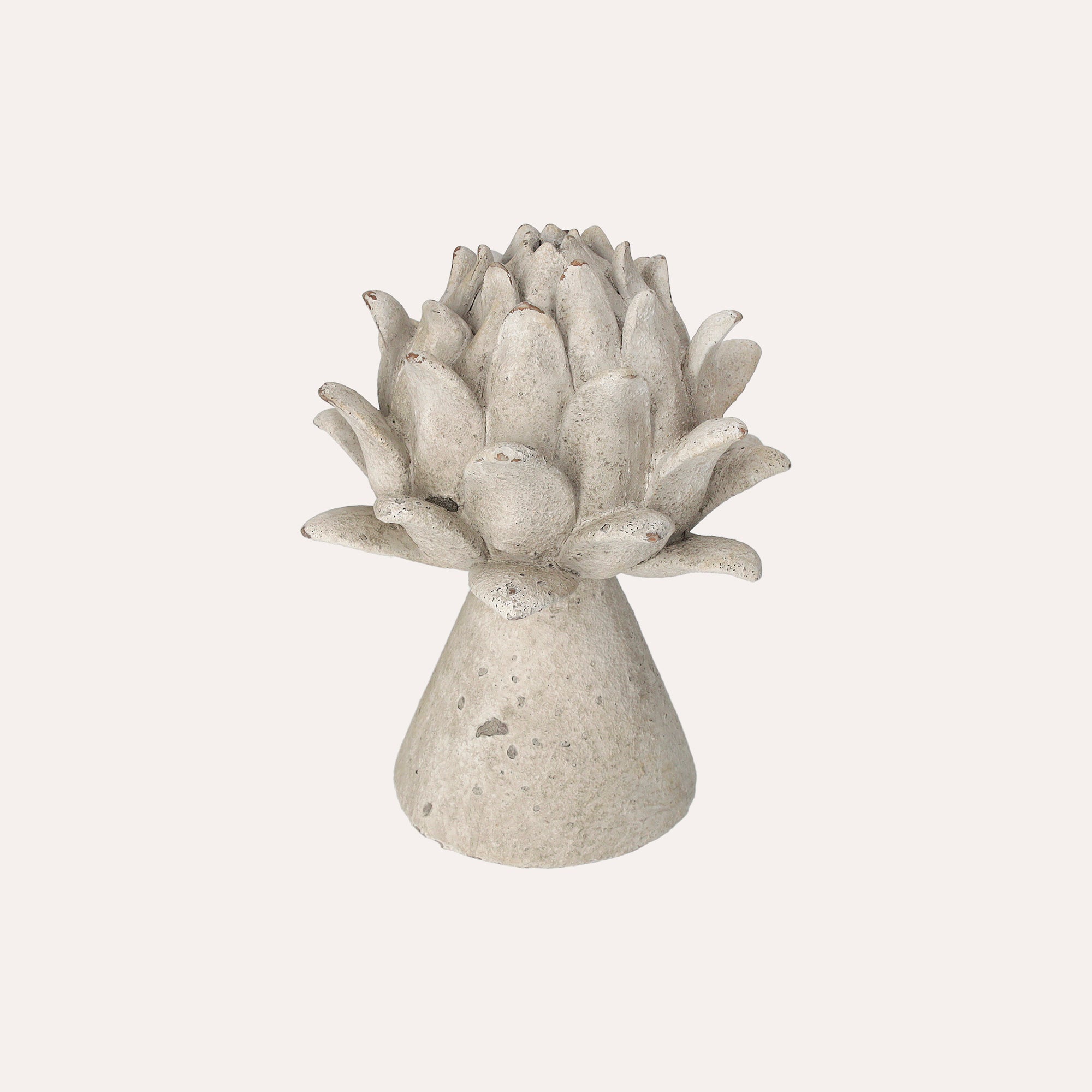 Bocciolo decorativo in resina grigia decapata, perfetto per interni ed esterni. Aggiunge un tocco di eleganza shabby chic agli spazi.