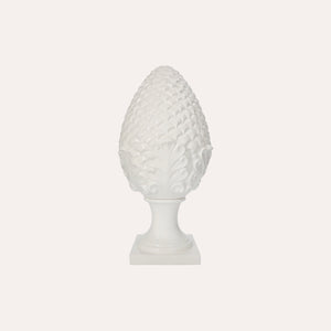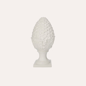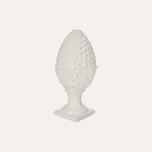 Decorazione a forma di pigna in ceramica bianca, di dimensioni piccole. Elegante e raffinata, è ideale come soprammobile da appoggio su tavoli o mensole. Realizzata artigianalmente con attenzione ai dettagli, è 100% Made in Italy.