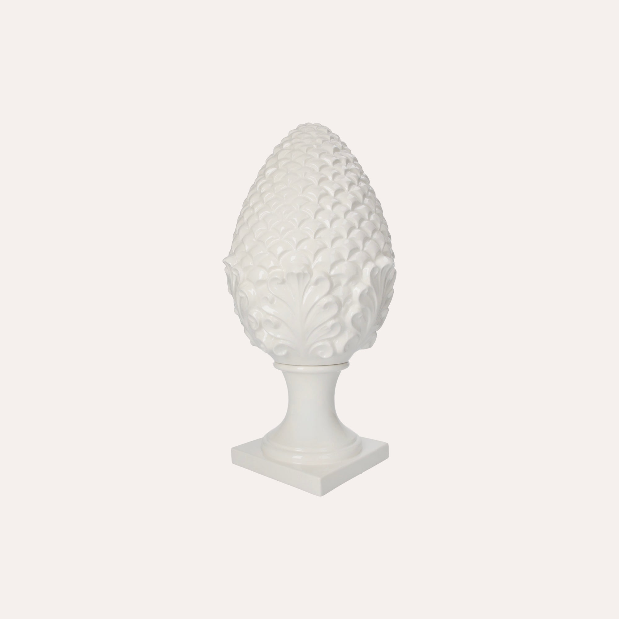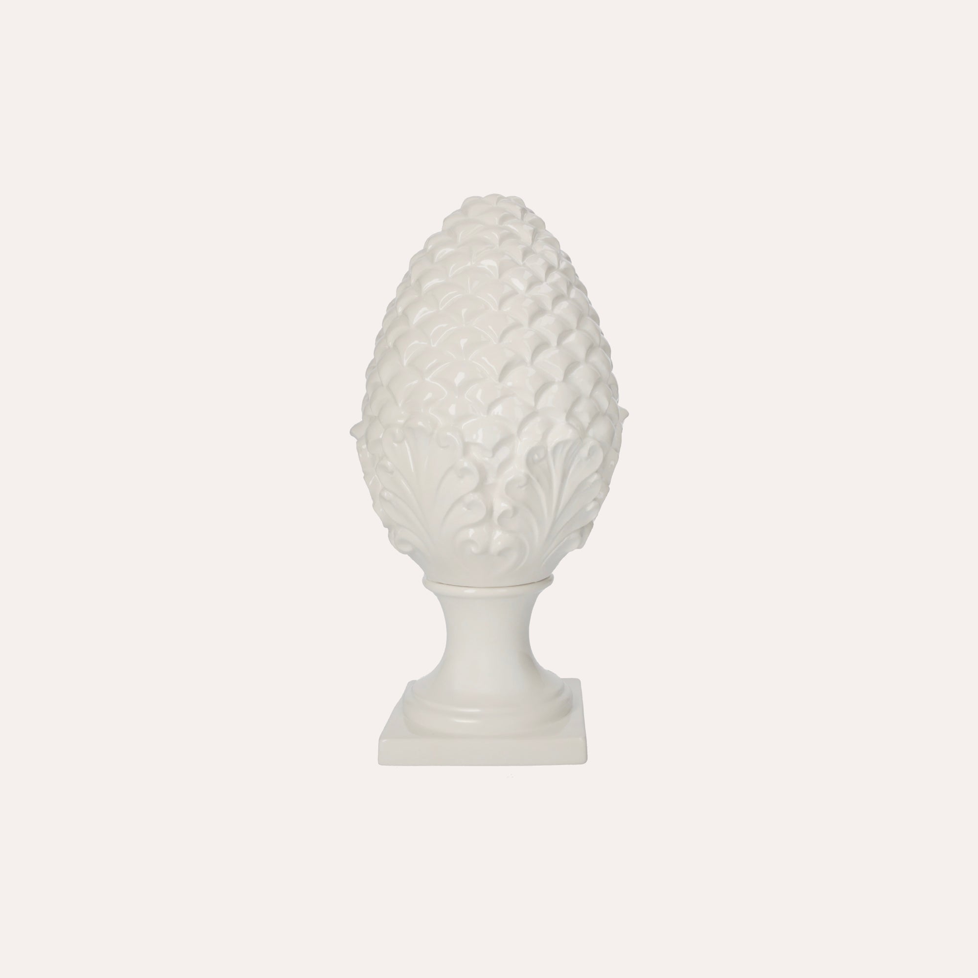 Questa decorazione a forma di pigna in ceramica bianca, di misura piccola, aggiunge un tocco di raffinatezza e eleganza al tuo arredamento; perfetta come soprammobile da appoggio su un tavolo o in una mensola, la sua realizzazione è interamente artigianale, curata nei minimi dettagli, e riflette la qualità e il design tipici del 100% Made in Italy; un pezzo distintivo che arricchisce qualsiasi ambiente con la sua bellezza semplice e sofisticata.