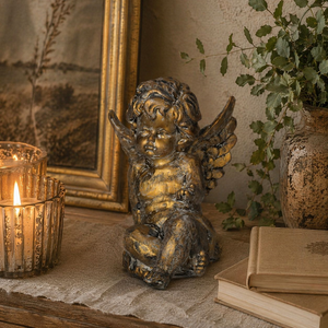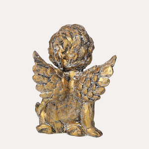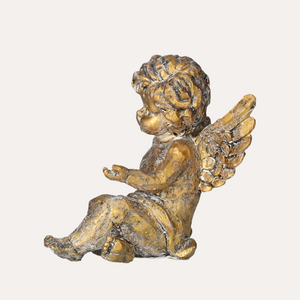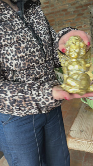 Decorazione a forma di putto appoggiato realizzata in resina color oro, dal design elegante e classico. Ideale per arricchire mensole, tavolini o composizioni decorative con un tocco raffinato.