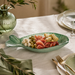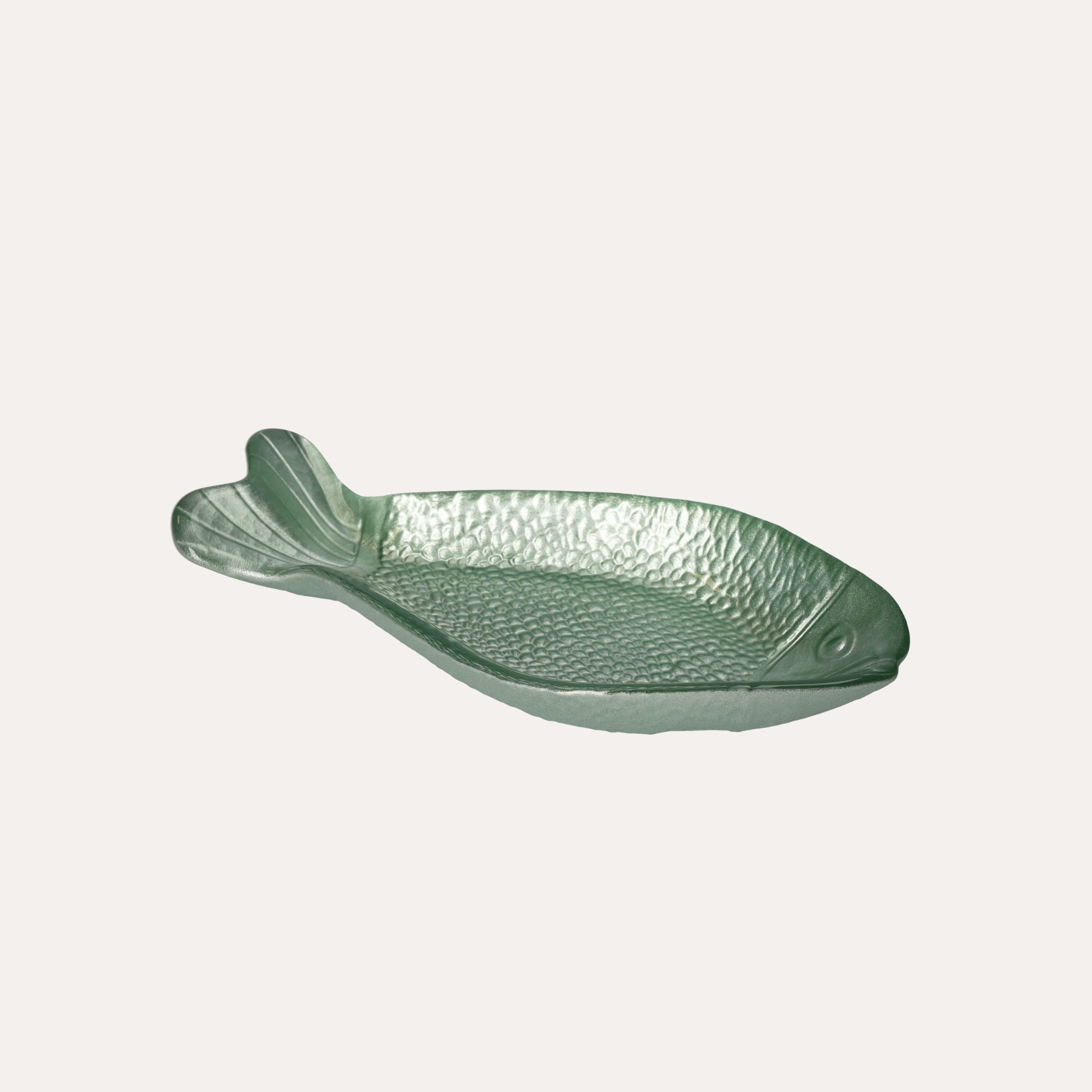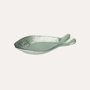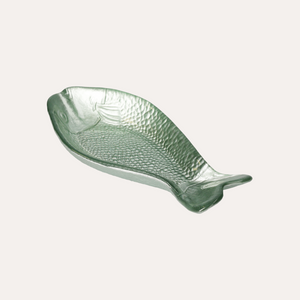 Elegante set da 2 piatti antipastiera in vetro verde a forma di pesce, perfetti per servire antipasti, finger food o stuzzichini con stile. Il design ispirato al mare dona un tocco fresco e originale alla tavola, ideale per mise en place estive o occasioni speciali. Pratici e decorativi, valorizzano ogni presentazione.