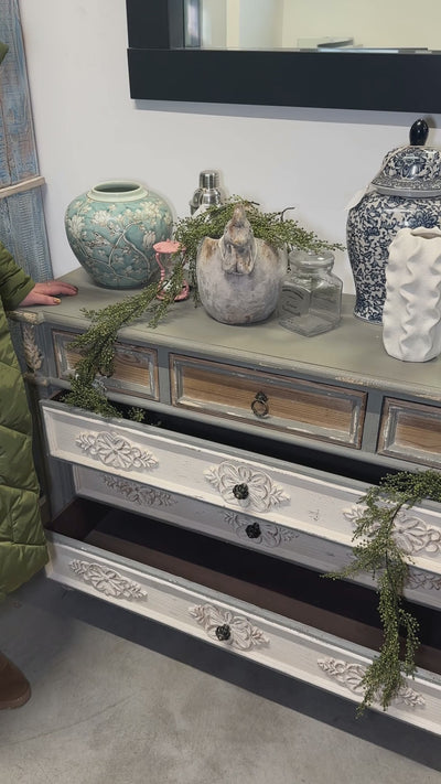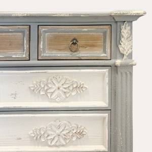 The gray, white, and light brown finish, with delicate pickled effects, enhances the carved floral decorations and vintage-style handles, creating a perfect balance between classic charm and modern functionality.