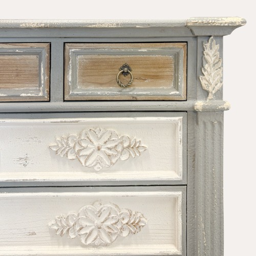 Equipped with large drawers, it offers excellent storage capacity and is perfect for the living room, entrance hall, bedroom or living area, adapting naturally to shabby, country chic and Provençal contexts.