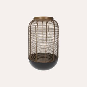 Gold and black metal cage lantern with glass candle holder. Industrial and modern in style, ideal for elegantly illuminating and decorating interior spaces.