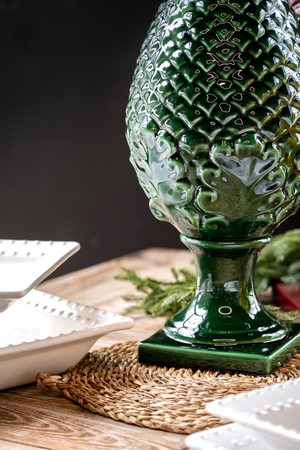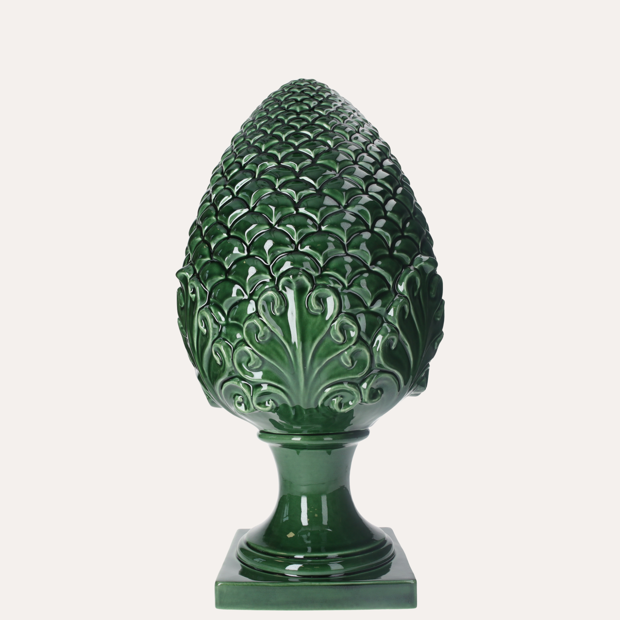 Elegante pigna decorativa in ceramica verde, realizzata artigianalmente in Made in Italy. Simbolo di fortuna e prosperità, è perfetta per arricchire ambienti interni ed esterni con stile e tradizione. Ideale come soprammobile di grande impatto per ingresso, soggiorno o arredo contract.