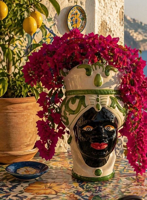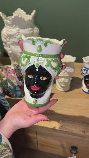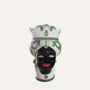 Elegante testa di moro in versione piccola con finitura verde, realizzata in ceramica Made in Italy. Un oggetto decorativo raffinato in stile veneziano, perfetto per arricchire ambienti interni con un tocco di colore e carattere. Ideale come soprammobile o piccolo vaso decorativo per soggiorno, cucina o ingresso.