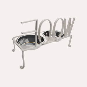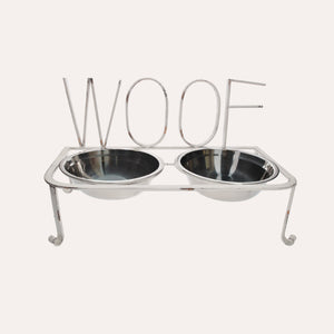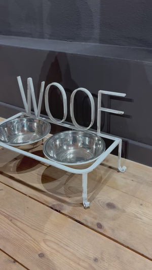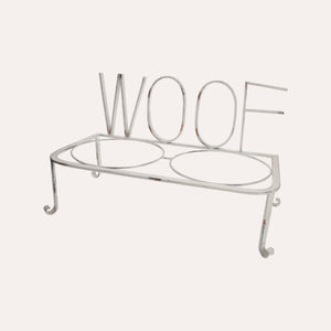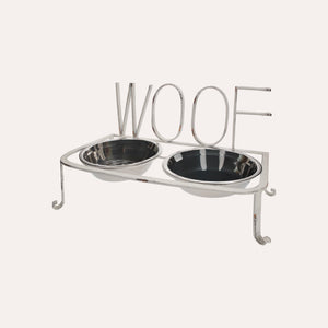 Stainless steel bowls with a "Woof"-decorated iron stand. Easy to clean and ideal for medium and small dogs. Dimensions: H 28 cm, W 49 cm, D 26 cm.