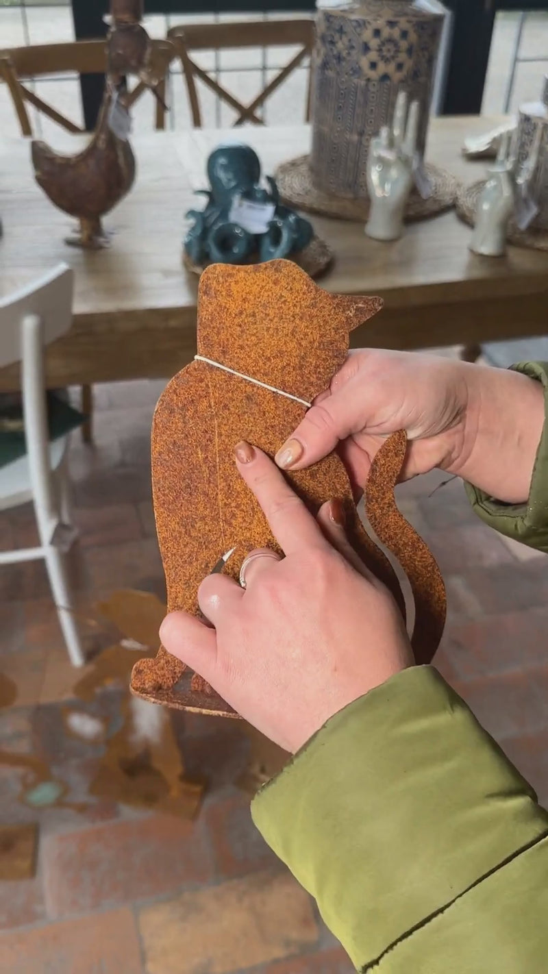 The rusty brown Corten iron cat is a lovely outdoor decoration.