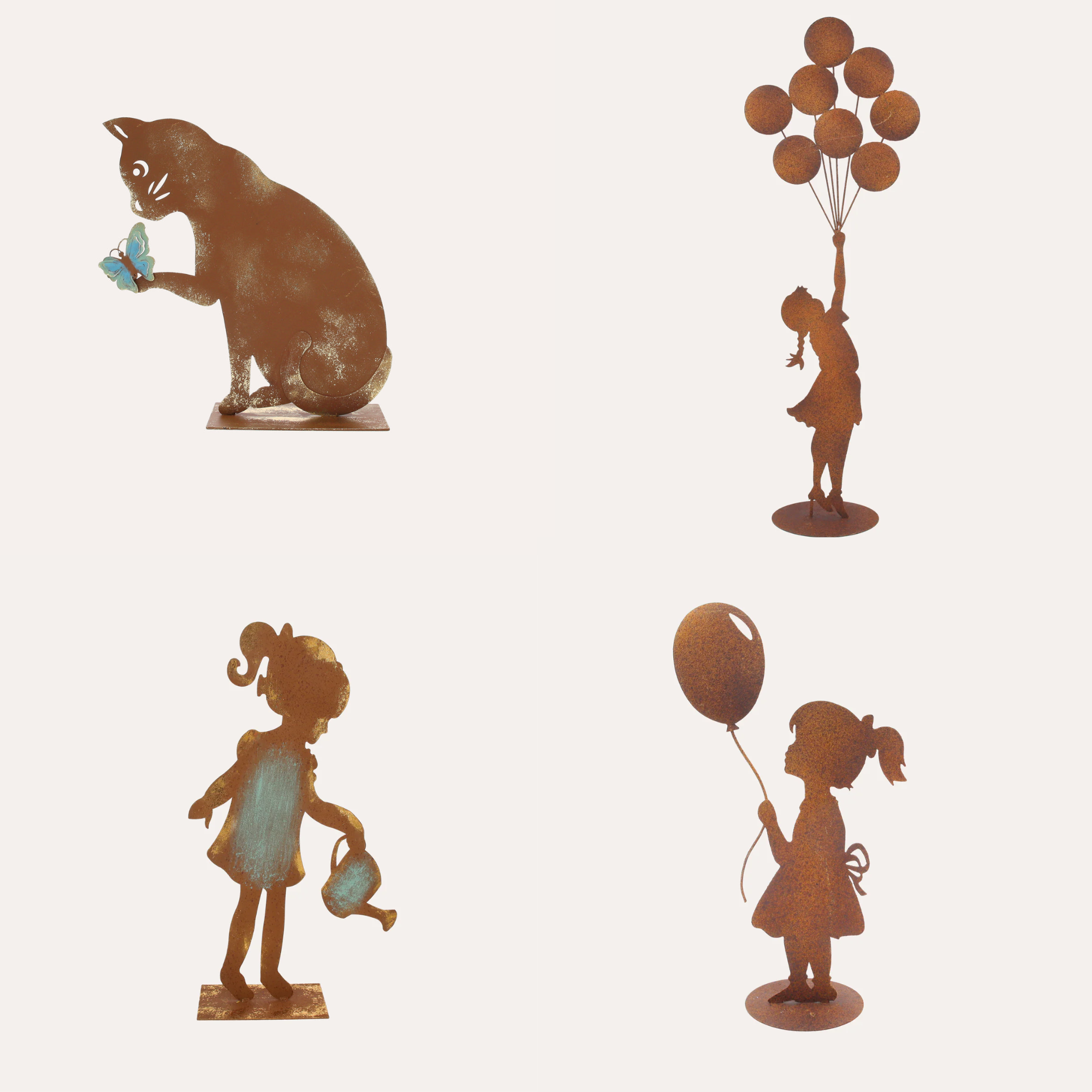 Corten Iron Girls and Cat Set - 4 Decorative Sculptures