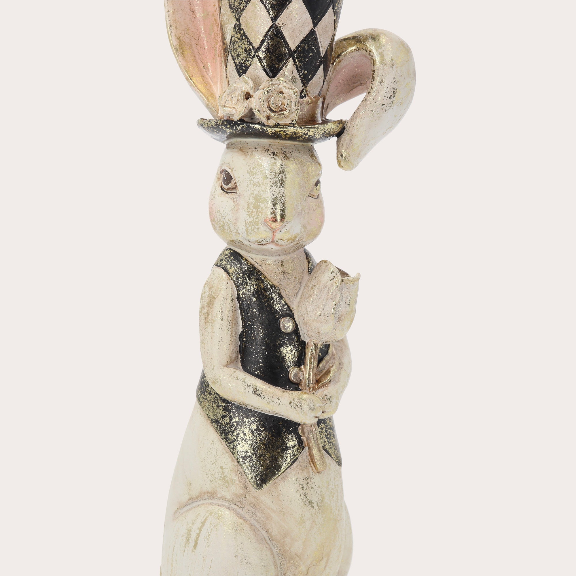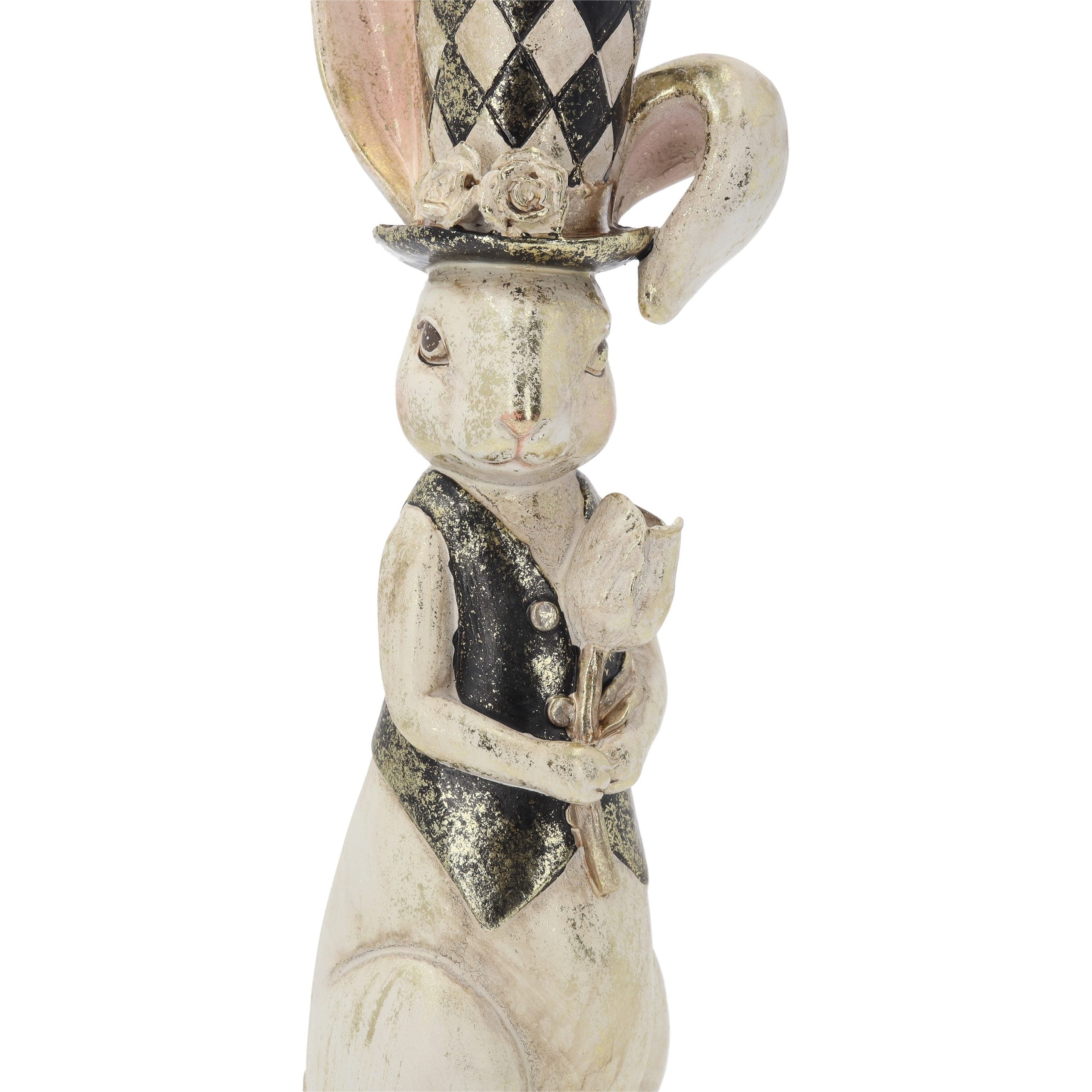 Add a touch of vintage charm to your space with this 38 cm tall resin rabbit statue. Holding a poppy and wearing a hat, the bunny, with one ear high and one low, captures attention with its refined details and bright gaze. Crafted from high-quality materials, this sculpture is perfect for decorating furniture, shelves, or desks, and also makes a great gift for literature lovers or collectors. Easy to match any decor, the rabbit arrives beautifully packaged and sealed, ready for display or gifting.