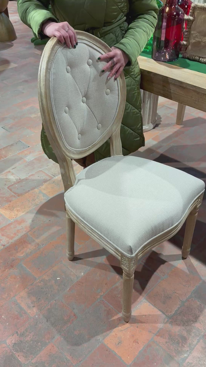 A pair of Louis XVI-style medallion chairs with elegant beige fabric seats and backrests. These classic, refined chairs, 101 cm tall, are perfect for furnishing a kitchen, dining room, or living room with a touch of luxury. The sturdy frame and carved details add a timeless charm, making them ideal for traditional or contemporary interiors. Comfort and style come together in these chairs, perfect for creating a sophisticated atmosphere in any space.
