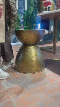 This elegant and glamorous gold metal drum coffee table is perfect for the living room. Diameter: 45 cm, height: 53 cm. Its sculptural design and gold finish create a refined style.