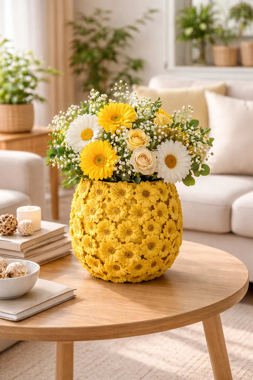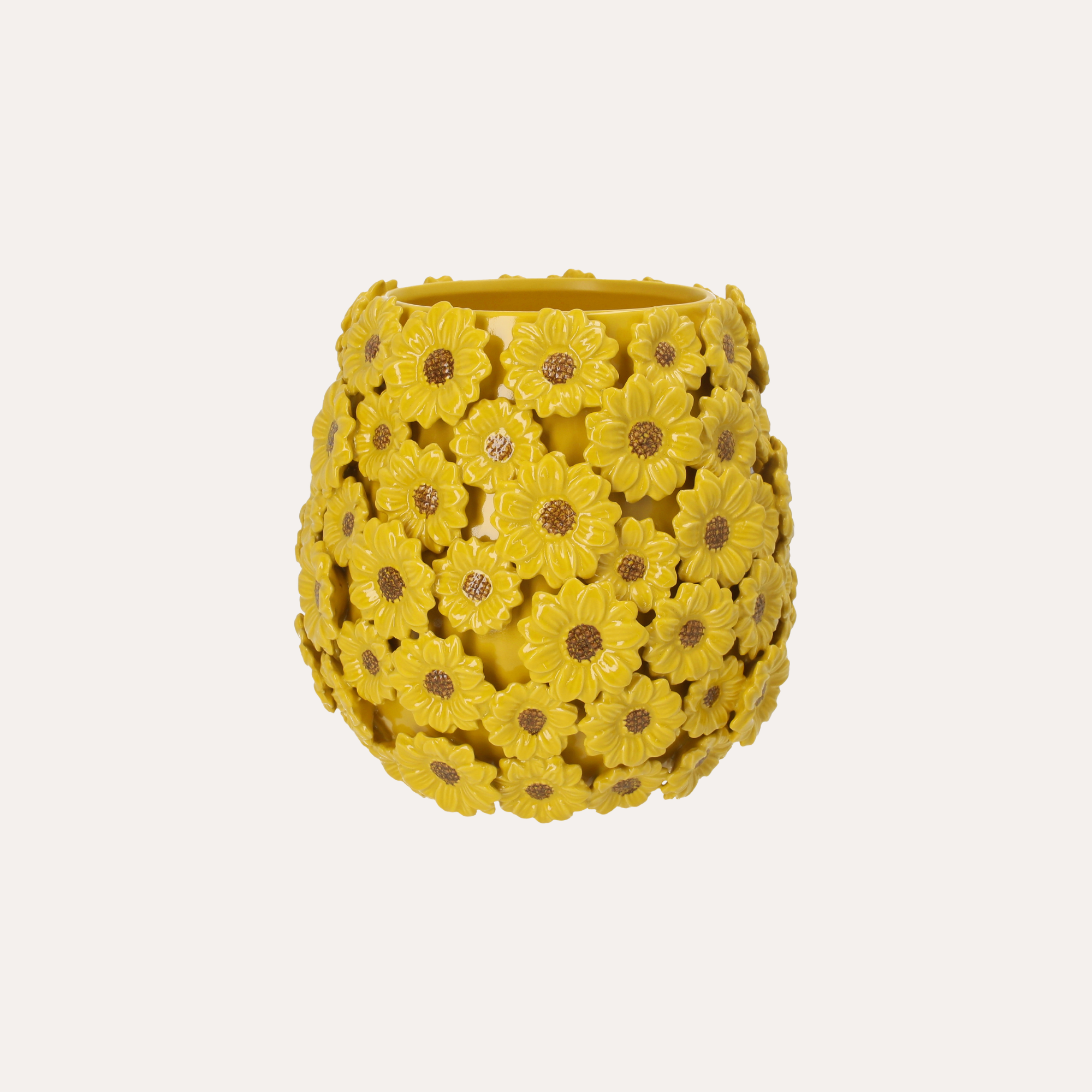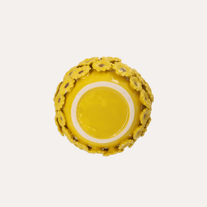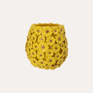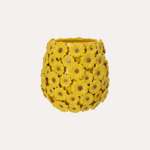 Vaso dal design elegante e luminoso, decorato con raffinate margherite gialle che donano un tocco fresco e primaverile agli ambienti.